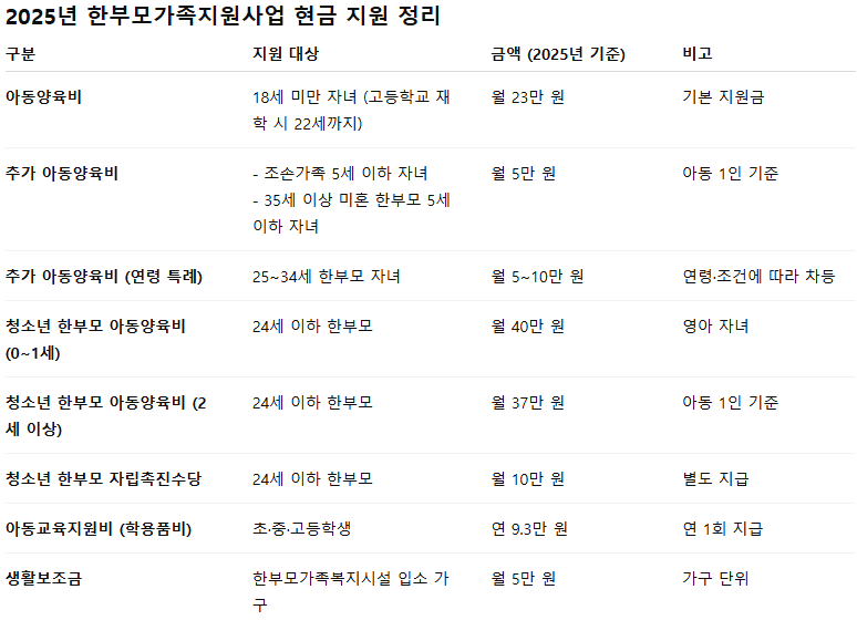 2025년 한부모가족지원사업은 자녀 양육비 월 23만 원, 청소년 한부모는 최대 월 50만 원 이상까지 현금 혜택을 받을 수 있습니다. 여기에 학용품비, 생활보조금, 추가 양육비까지 더해지면 실질적인 생활 안정에 큰 힘이 됩니다.