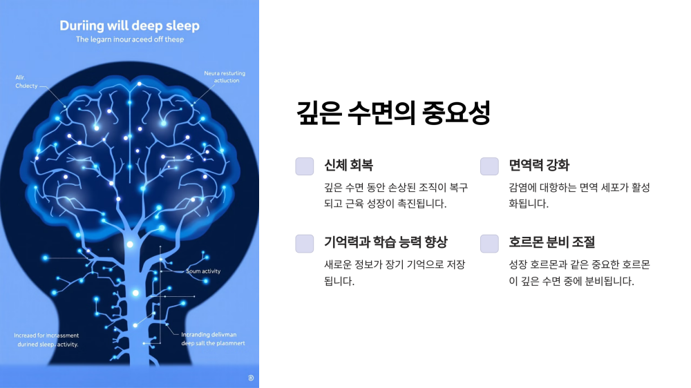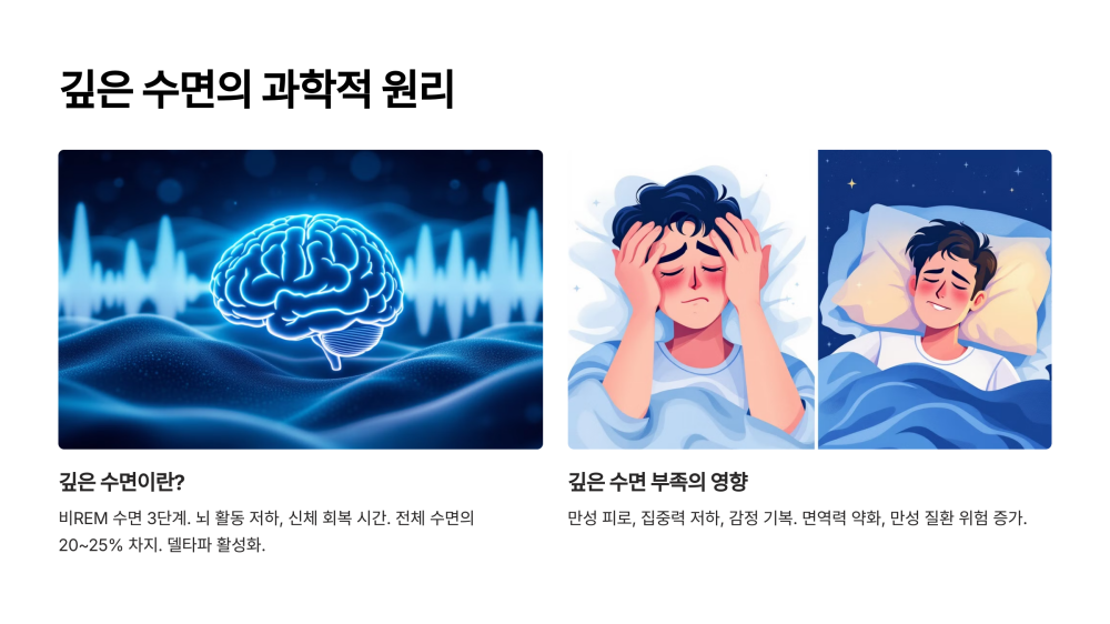 하루의 피로를 푸는 수면. 하지만 단순히 오래 자는 것만으로 충분하지 않습니다. 수면의 질, 특히 깊은 수면이 건강과 일상에 얼마나 큰 영향을 미치는지 알고 계신가요? 깊은 수면은 뇌와 신체가 진정으로 회복되는 시간으로, 면역력 강화, 기억력 향상, 그리고 스트레스 해소에 필수적입니다. 이 가이드는 깊은 수면의 과학적 원리와 실천 가능한 팁을 통해 건강하고 활력 넘치는 삶으로 이끄는 길을 제시합니다.