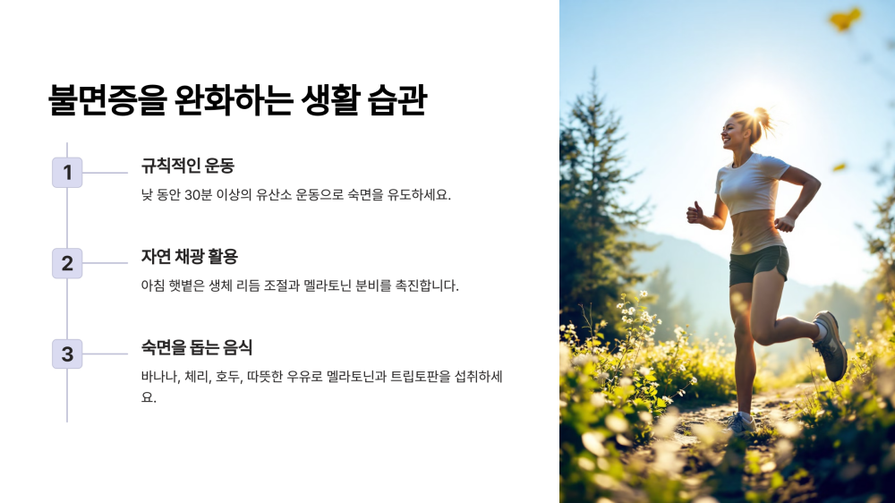 - 낮 동안 30분 이상의 유산소 운동은 숙면에 도움이 됩니다. 단, 잠들기 직전의 운동은 피하세요.