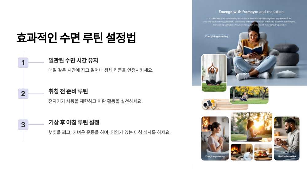 - 수면 시간 확보: 성인은 7~9시간의 수면이 필요합니다. 충분한 수면 시간을 계산해 취침 시간을 설정하세요.