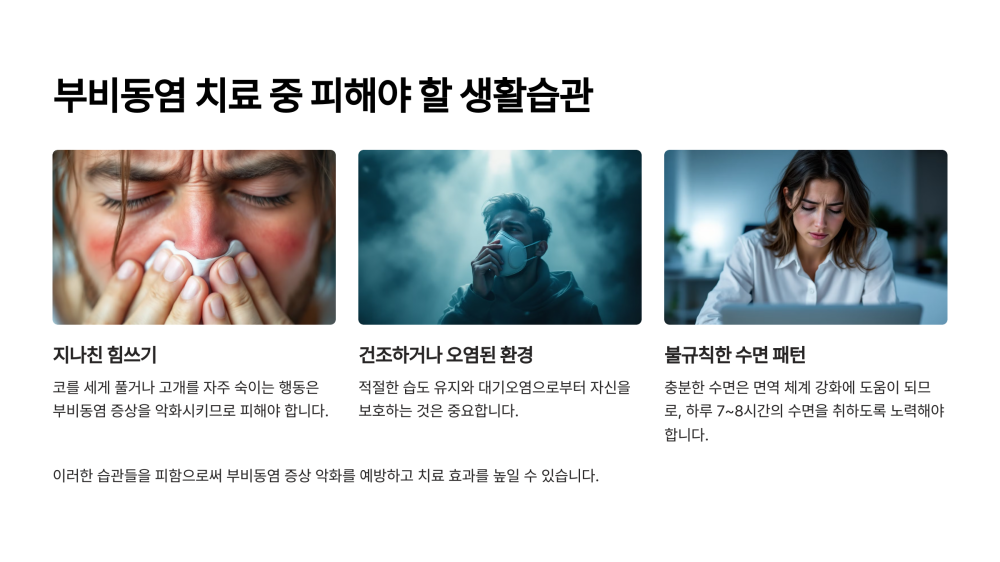 • 코를 세게 풀거나 고개를 자주 숙이는 행동은 부비동 압력을 높여 통증을 유발할 수 있습니다.