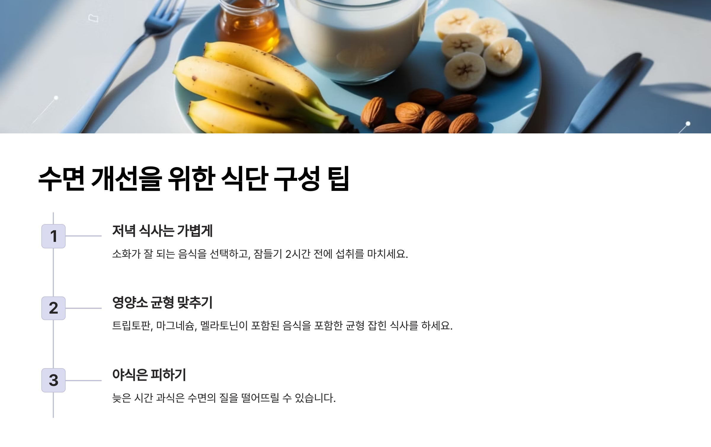 숙면은 단순히 좋은 침대와 환경만으로 해결되지 않습니다. 올바른 음식을 선택하고 영양소를 활용하면 수면의 질을 크게 개선할 수 있습니다. 오늘부터 당신의 식단에 작은 변화를 주어, 건강한 수면과 더 나은 하루를 만들어 보세요.