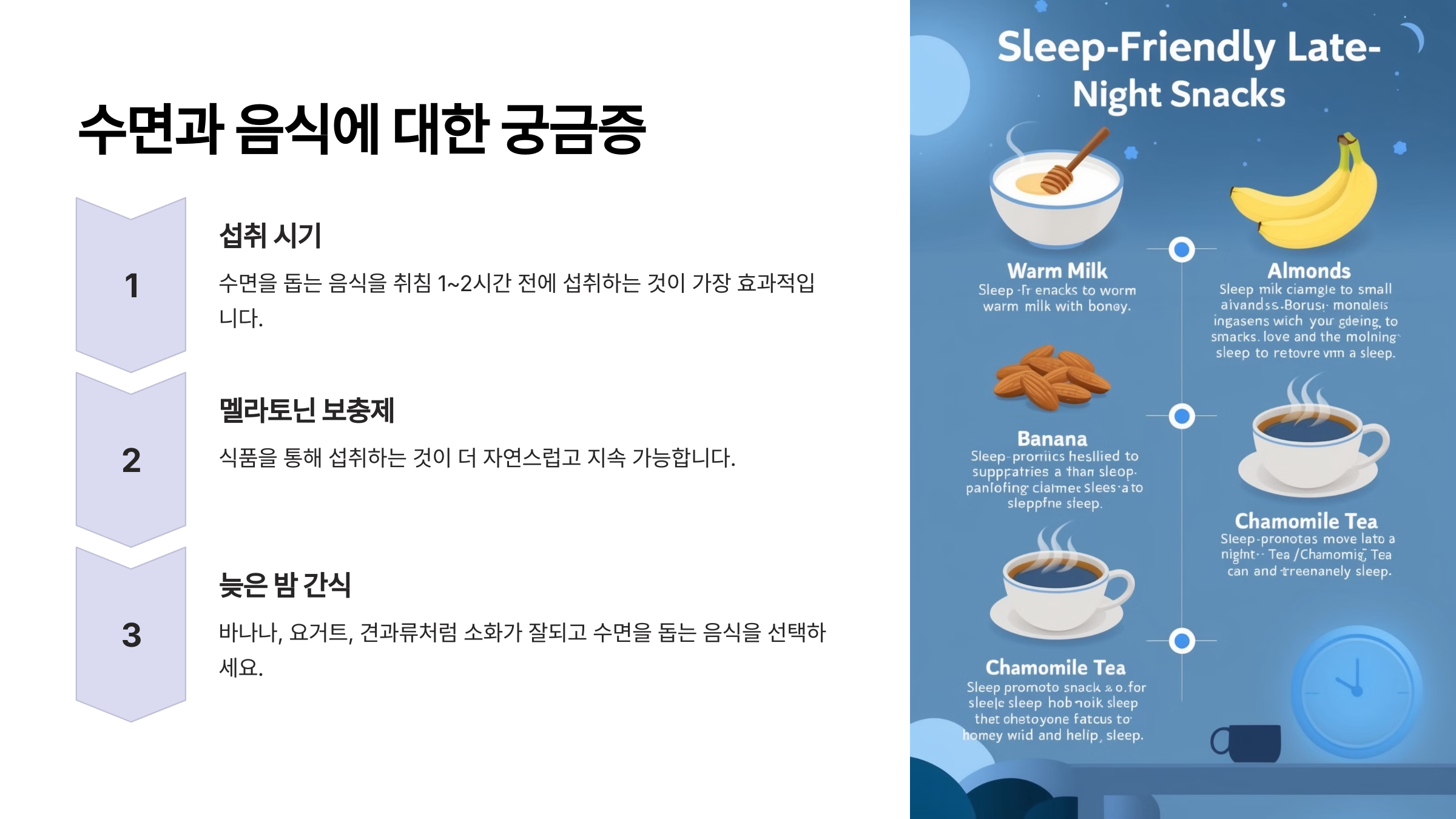 수면을 돕는 음식을 취침 1~2시간 전에 섭취하는 것이 가장 효과적입니다.