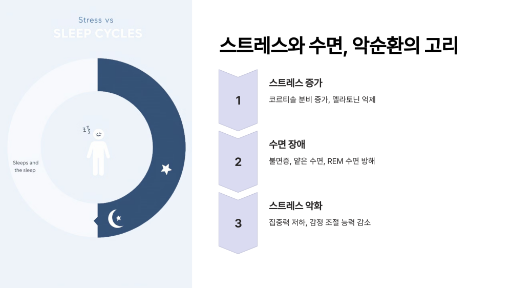 - REM 수면 방해: 스트레스는 꿈을 꾸는 단계인 REM 수면을 얕게 만들어 수면의 회복 효과를 떨어뜨립니다.