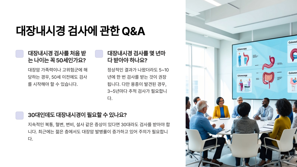 - 대장암 가족력이나 고위험군에 해당하는 경우, 50세 이전에도 검사를 시작해야 할 수 있습니다.